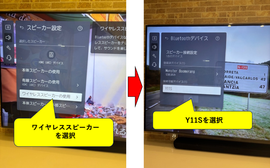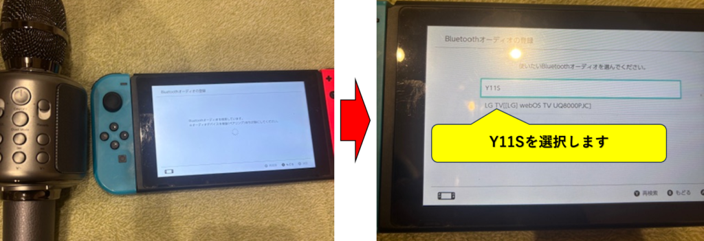 手順は上記にある通り、マイクの電源を長押しして「Bluetooth mode」のアナウンスが流れたら、テレビの設定画面から「y11s」を選ぶだけ。すぐに「Bluetooth connected」と鳴り、接続完了。初心者の私でも簡単に接続が出来ました。