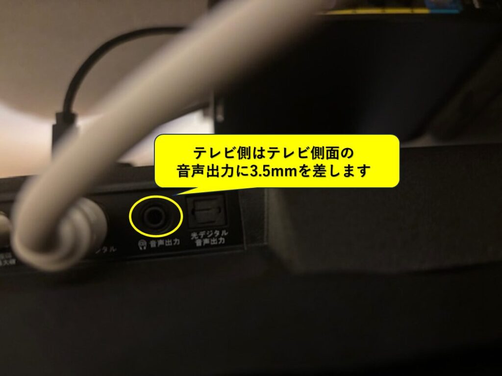 - 付属しているオーディオケーブルの「3.5mmステレオミニプラグ」側(細いピン)を、テレビのイヤホンジャックにしっかりと差し込みます。