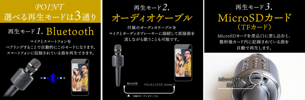 SM-KM21は、Bluetoothだけでなく「オーディオケーブル接続」「SDカード再生」を含む3種類の再生モードに対応しています。付属のオーディオケーブルを使えば、スマートフォンやオーディオプレイヤーなどに直接つないで曲を流しながら歌うことができます。