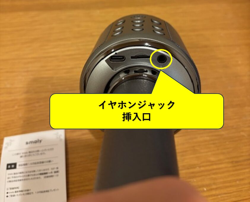 マイク本体にはイヤホンジャックも搭載されています。 ここにイヤホンを挿してみると、マイク本体のスピーカーからは音が出なくなり、イヤホンから伴奏と自分の声(エコー付き)が聞こえてきました。