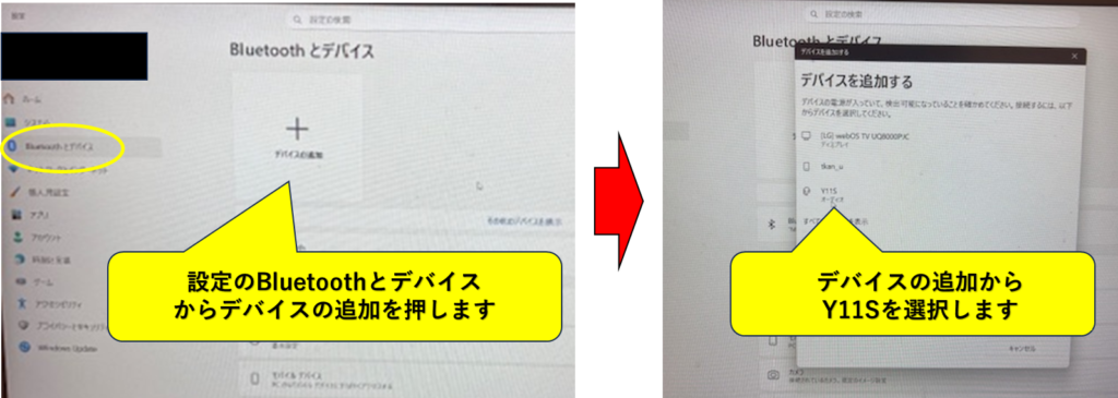 - デバイス一覧に「y11s」が表示されたら、それを選択して接続(ペアリング)を実行します。