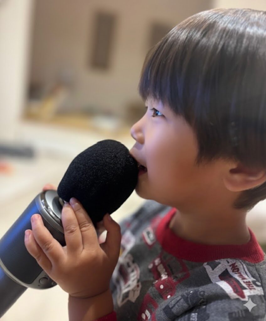 大人が持つ分には全く問題ありませんが、「子供には重すぎるかな?」と心配でした。 試しに3歳の息子に持たせてみたところ、すぐに両手でマイクを握りしめ、ノリノリで歌い始めました。