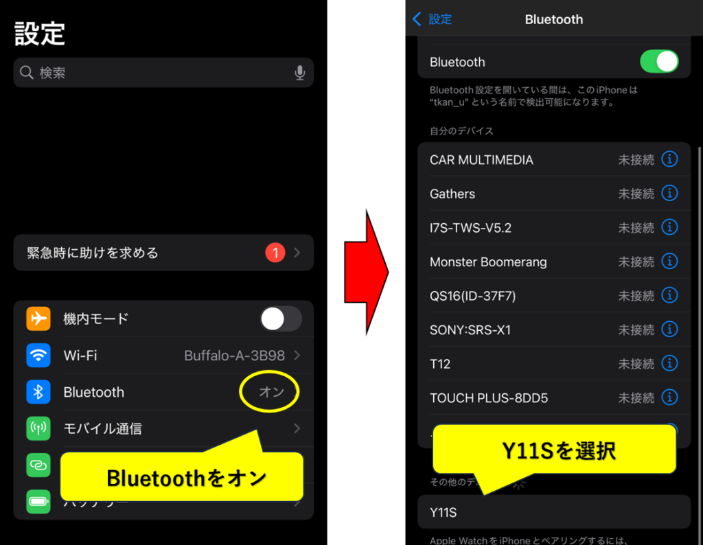 - Bluetoothがオフになっている場合は、オンに切り替えます。 利用可能なデバイスの一覧に「y11s」というモデル名が表示されるので、これをタップして選択してください。