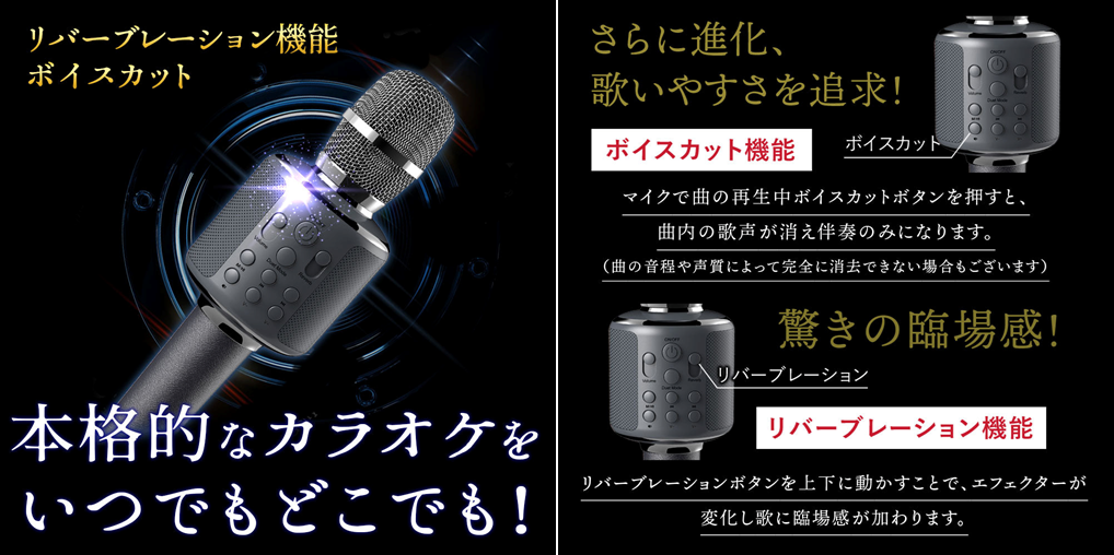 マイクにはリバーブレーション機能(エコー機能)とボイスカット機能も搭載!