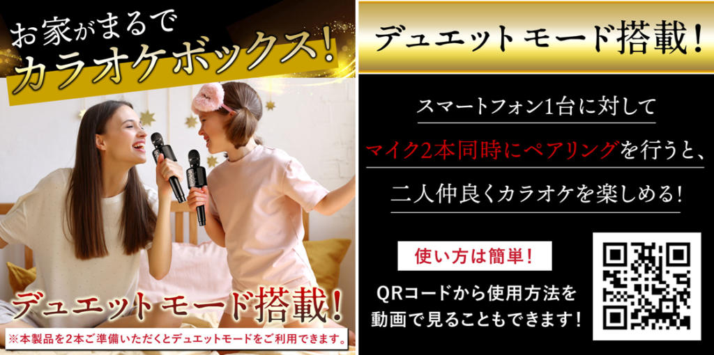 マイクを2本同時にペアリングする事によってデュエットモードも可能となっています。デュエットモードの詳しいやり方は以下の通りです。