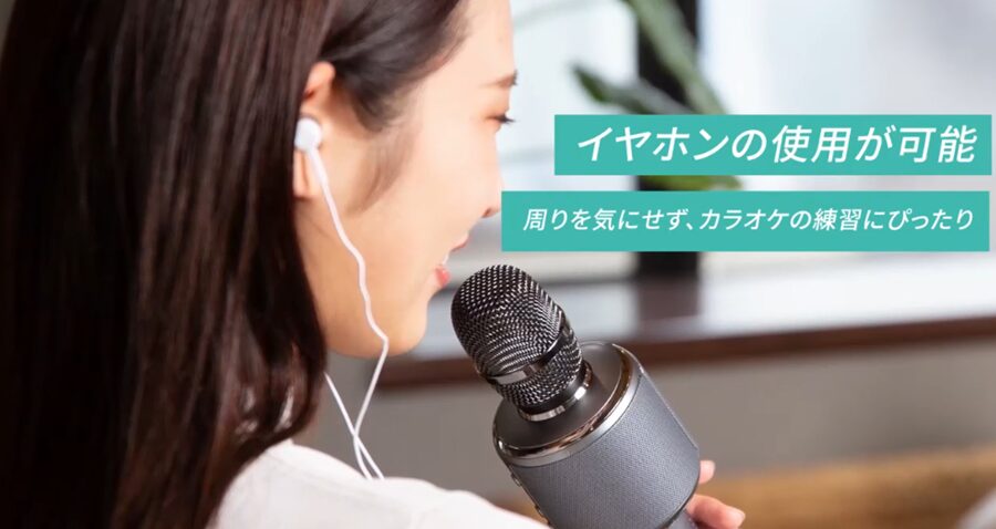 このようにマイク本体にイヤホンを直接接続してイヤホンから音を出す事も可能です。その為、1人でお家カラオケ練習するにも最適です。