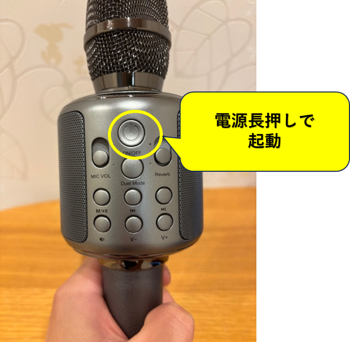 - まず、マイク本体の電源ボタンを長押しします。 「Bluetooth mode」という音声アナウンスが流れたら、マイクがペアリング(接続待ち)状態になった合図です。