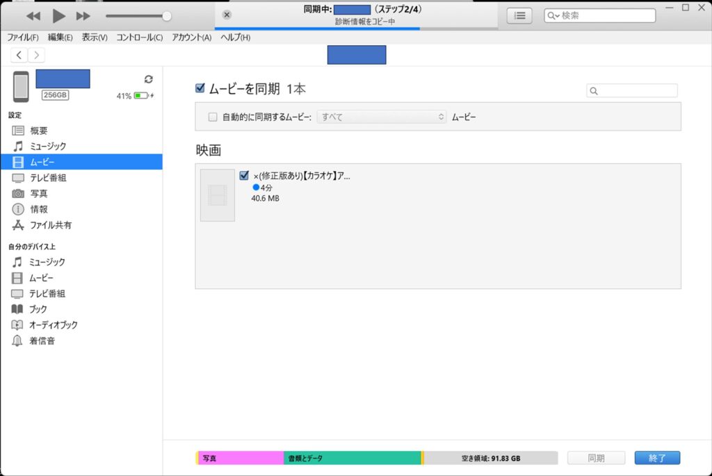 ④変換した動画をitunesにて送信を行います。itunesを開き、Iphone接続後左欄の「ムービー」を押します。
