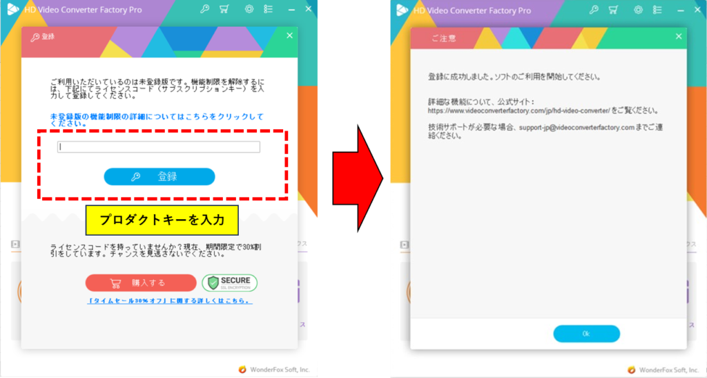 ③設定完了後、HD Video Converter Factory Proを立ち上げると以下の様にプロダクトキー入力を求められます。
