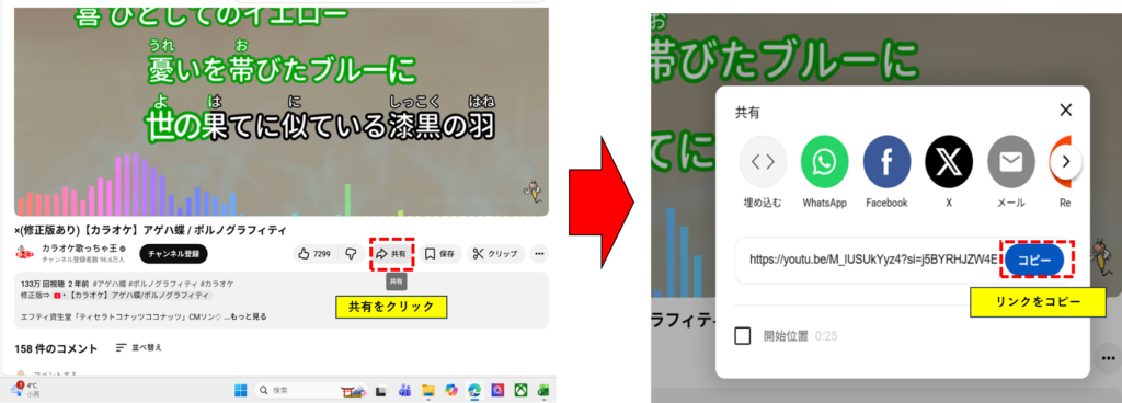 ➀まずYoutubeを開き、ダウンロードしたい楽曲にアクセスします。アクセスした後は動画下の「共有」をクリックし