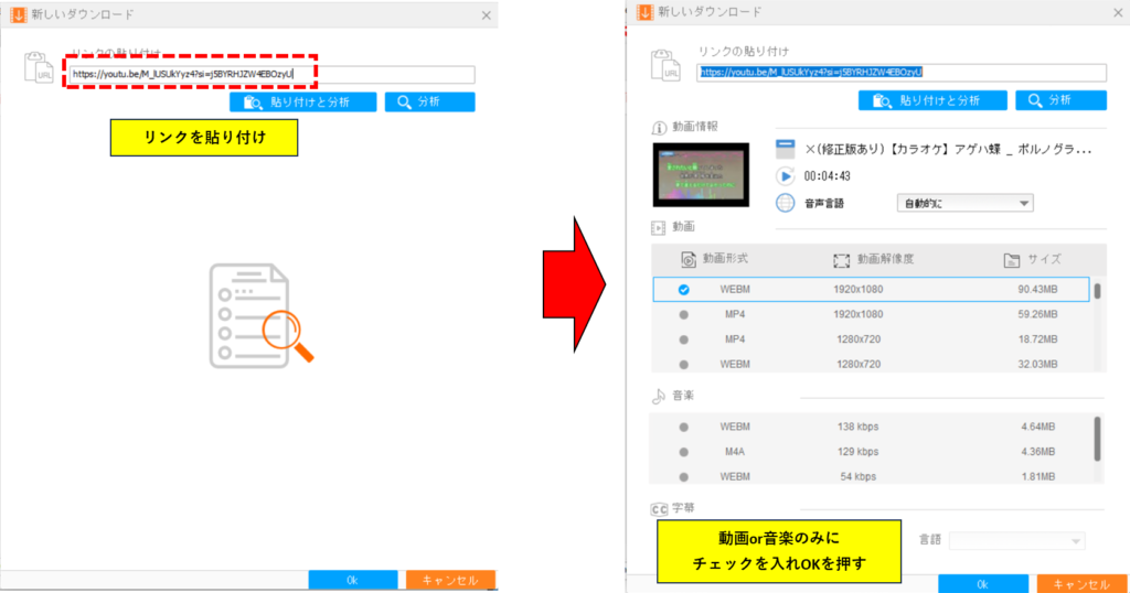 その後動画情報と動画or音楽どちらで出力するか、動画解像度などを選択する部分が出てくるので自分が出力したい