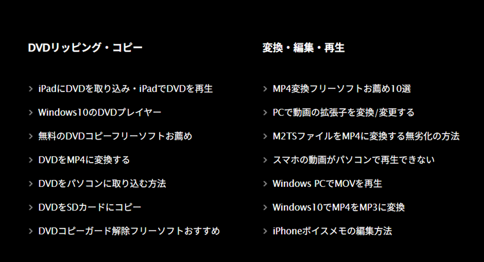 HD Video Converter Factory Pro では、公式サイト内にDVDリッピング・コピー、動画の変換・編集・再生、ダウンロード方法やエラー時の対処法まで、さまざまな使い方が丁寧に記事として掲載されています。